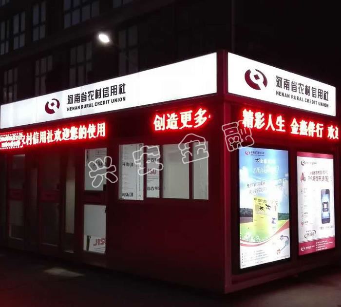 自助銀亭由五部分組成:加鈔區(qū)設(shè)備間、自助交易區(qū)、VI形象燈箱、底座、地基